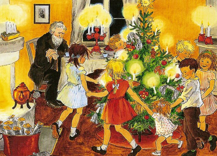 På julaftonens morgon vaknade jag tidigt och sprang ner i köket i bara nattskjortan och – oj, vad där var fint! Där låg nya trasmattor på golvet, och det satt rött och grönt och vitt krusat silkepapper omkring järnstången vid spisen, och det låg en julduk på det stora fällbordet, och alla kopparbunkarna var nyskurade. Jag blev så glad att jag måste krama mamma. Lasse och Bosse kom rusande strax efteråt, och Lasse sa att det kändes så julaktigt i magen på honom när han såg trasmattorna.”