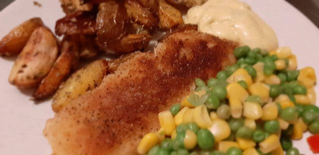 För den som tycker det är lite krångligt att laga fish and chips på traditionellt vis går det också bra att laga en svensk variant – panerad stekt fisk med kryddiga potatisklyftor. Det gjorde jag häromdagen och det blev mycket gott. Jag hade turen att ha fått tag i kolja, som jag tycker är ännu godare än torsk, men det går lika bra att göra på all vit fisk.