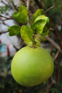 Pomelo – som egentligen heter Pompelmus (underbart namn!) – är en mycket stor citrusfrukt, omkring 20-25 cm i diameter och ofta päronformad. Ljusgult och sött fruktkött, men med kraftiga och sega hinnor som man inte äter. Smaken påminner lite om grapefrukt, men är inte alls lika besk.