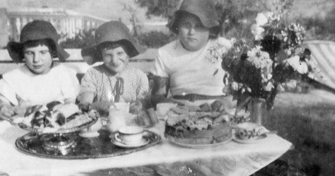 Det nya vetebrödet – kakor, mjuka kakor, söta bullar – kom redan från början att kopplas ihop med kaffe. Genom det började också kafferepen och kaffekalasen ta form, och bli allt vanligare. Och det fanns många anledningar att baka och ställa till med kaffekalas, inte bara om söndagarna. Namnsdagskalas var inte ovanligt (något som väl nästan är bortglömt numera). På bilden nedan firar min mamma Alice (i mitten) sin 5-årsdag, den 9 augusti 1933, tillsammans med sina kusiner Sara och Eva.