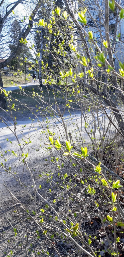 Nu är det vår… På riktigt… Väörmen har verkligen kommit och syrenbuskarna och de andra träden och buskarna på gården blir grönare för varje dag. Och visst man kan man njuta en kopp kaffe med grannarna ute på gården – bara man håller lagom avstånd går det alldeles utmärkt!