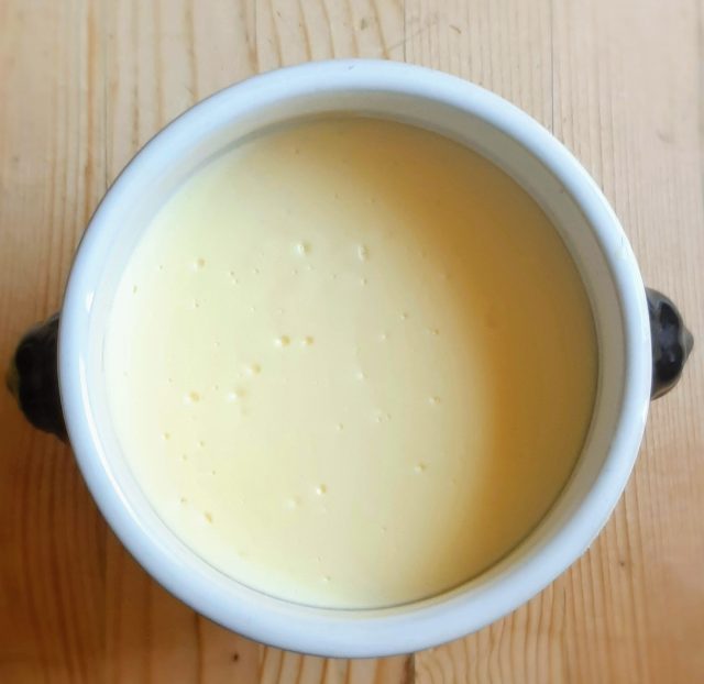 Gör så här: Häll mjölk, grädde och socker i en tjockbottnad kastrull. Vispa ner maizenan och låt alltsammans koka upp. Låt sjuda på svag värme i några minuter, tills blandningen blivit rejält tjock – rör hela tiden. Dra kastrullen från värmen och vispa i äggulorna.