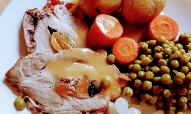 Igår lagade jag till en fläskkarré, som jag späckade med katrinplommon och torkade aprikoser. Till det en härlig gräddsås, kokt potatis och syltlök – godare blir det inte!