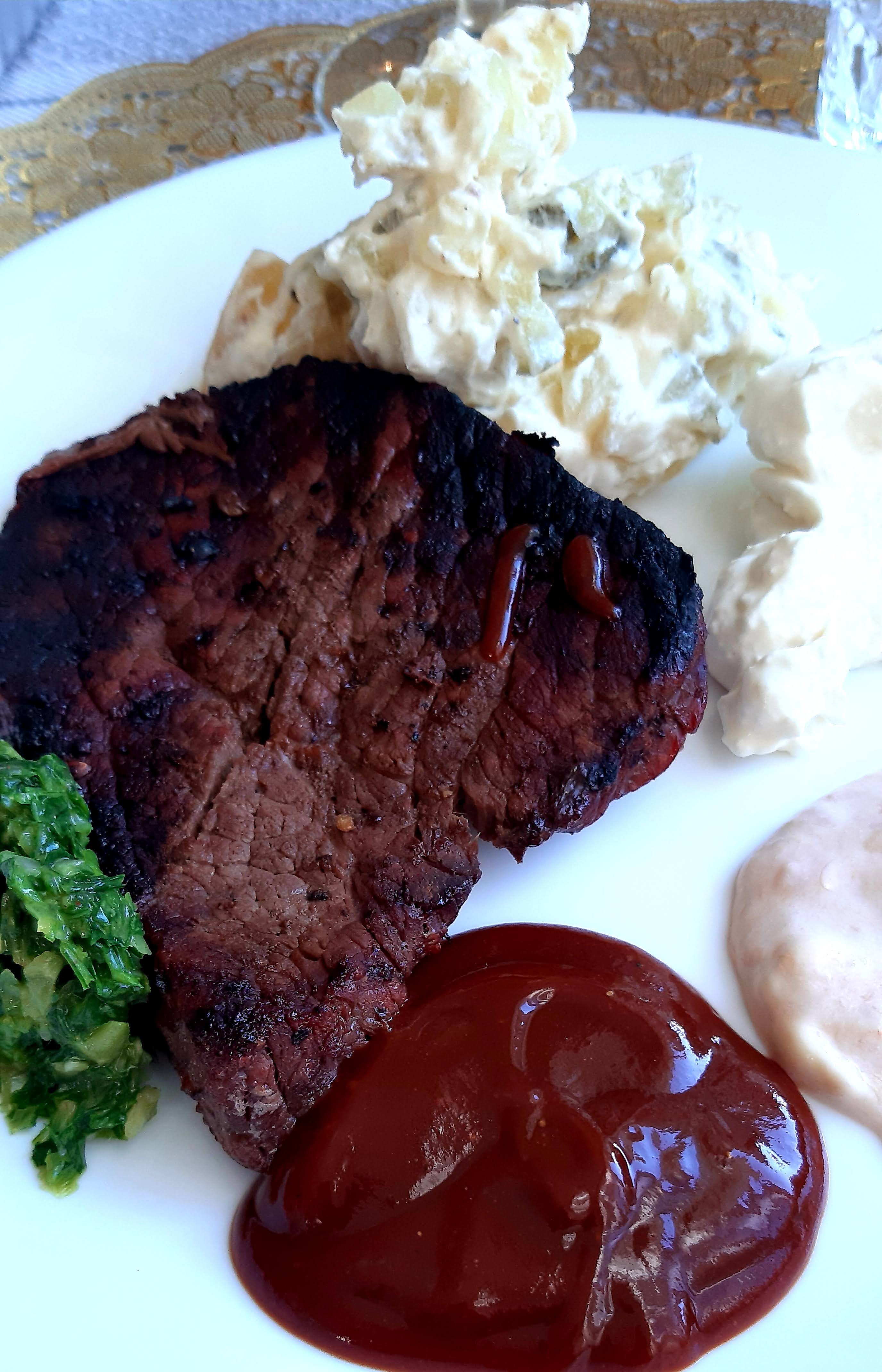 Till köttet serverades potatissallad och olika tillbehör, bland annat chimmichurri, sonens hemgjorda (och sanslöst goda!) barbecuesås, och hans flickväns supergoda chutneyröra.