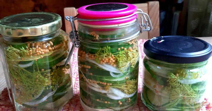 Gör så här: Skiva gurka och lök tunt, varva tillsammans med senapsfrö och dillkronor i burkar (jag tycker det blir bäst att lägga in i flera små burkar än i en stor).