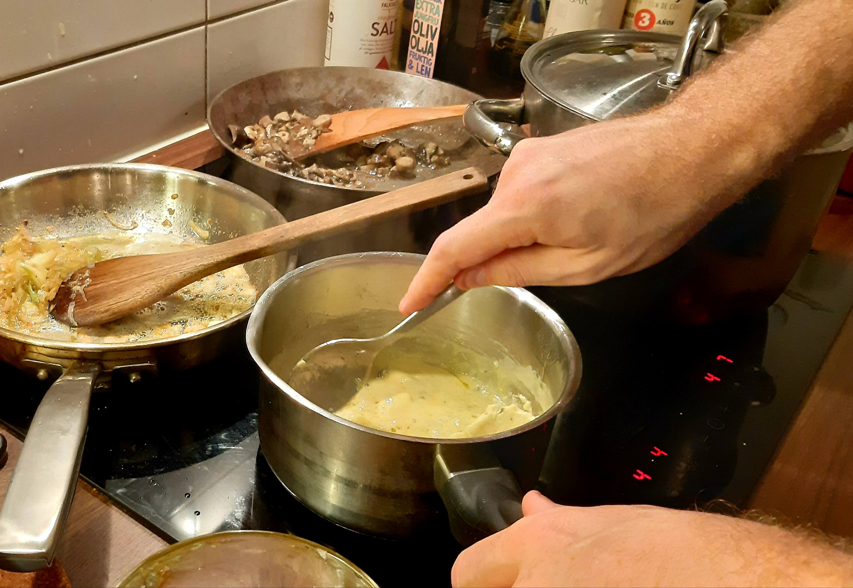 Gör så här: Skala och hacka lök och vitlök och fräs i smör och olivolja tills den blir genomskinlig. I en annan panna förväller du svampen (på låg till medelstark värme) tills vattnet börjar koka in, låt den då fräsa med en klick smör. När svampen fått lite färg häller du ner den i lökblandningen och låter den puttra på svag värme ytterligare 5-10 minuter.