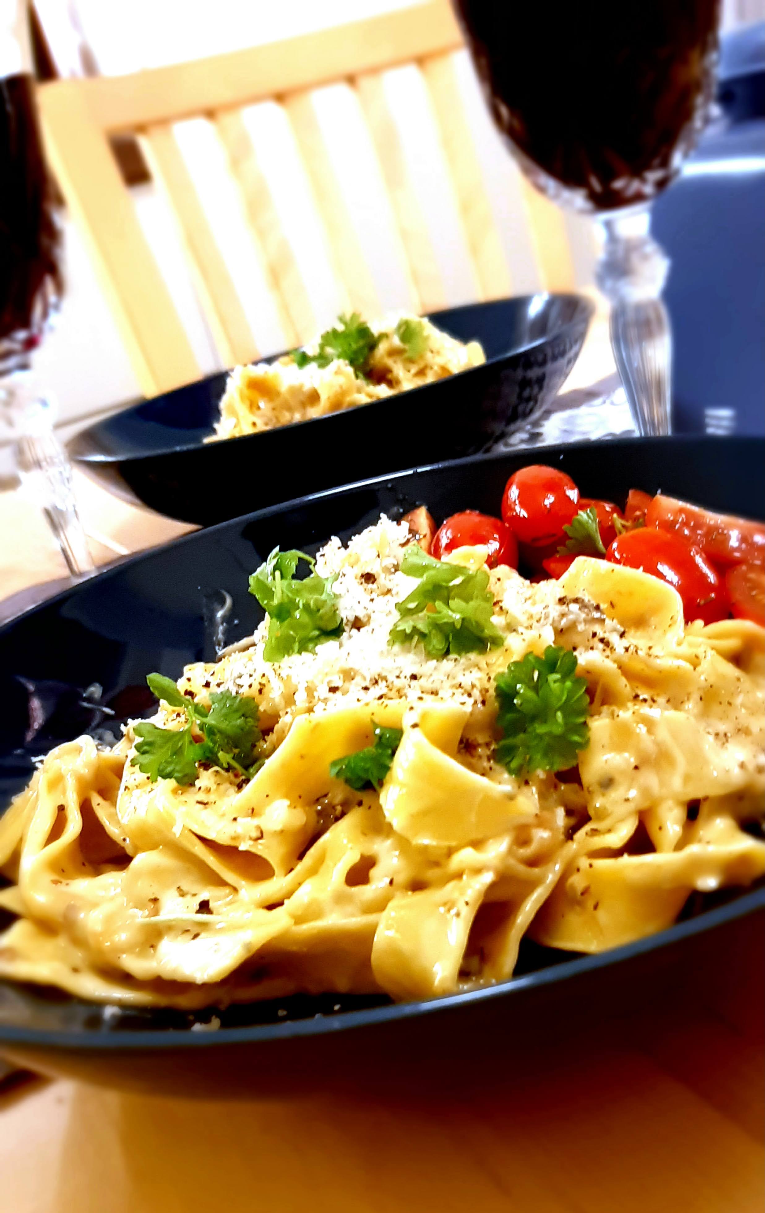 Koka pasta av valfri sort al dente och häll av. Blanda pastan med svamp- och lökblandningen och ostsåsen och servera, gärna med lite tomater till. Riv parmesan över och garnera med persilja. Alldeles särskilt gott att avnjuta med ett glas rött…