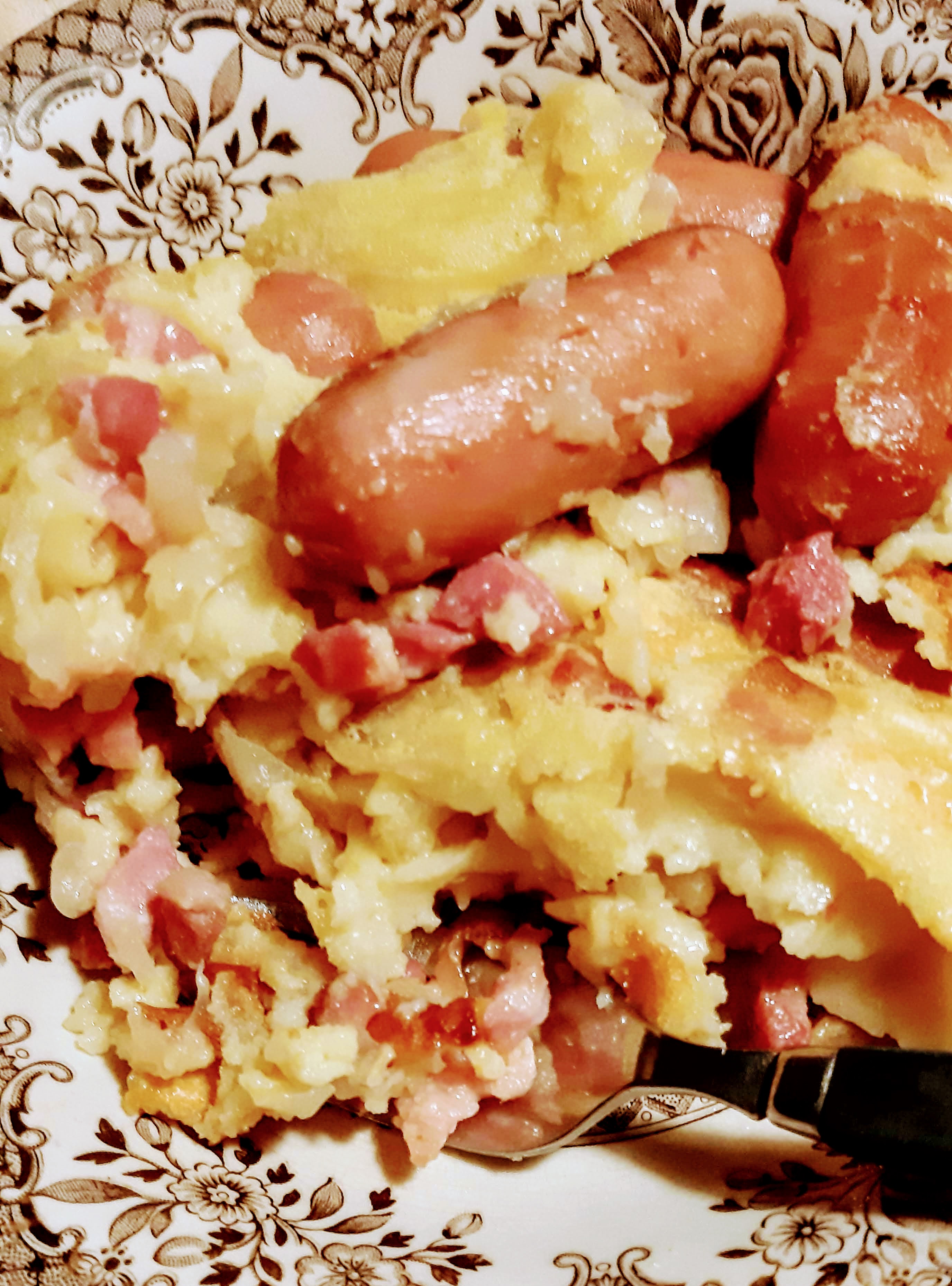 Den här gången fyllde jag den här goda, lättlagade puddingen inte bara med lök och prinskorv utan även med bacon som fick fräsa med korven och löken. Jag har också gjort den med strimlor av julskinka och kokt tunga. Perfekt lunchrätt!
