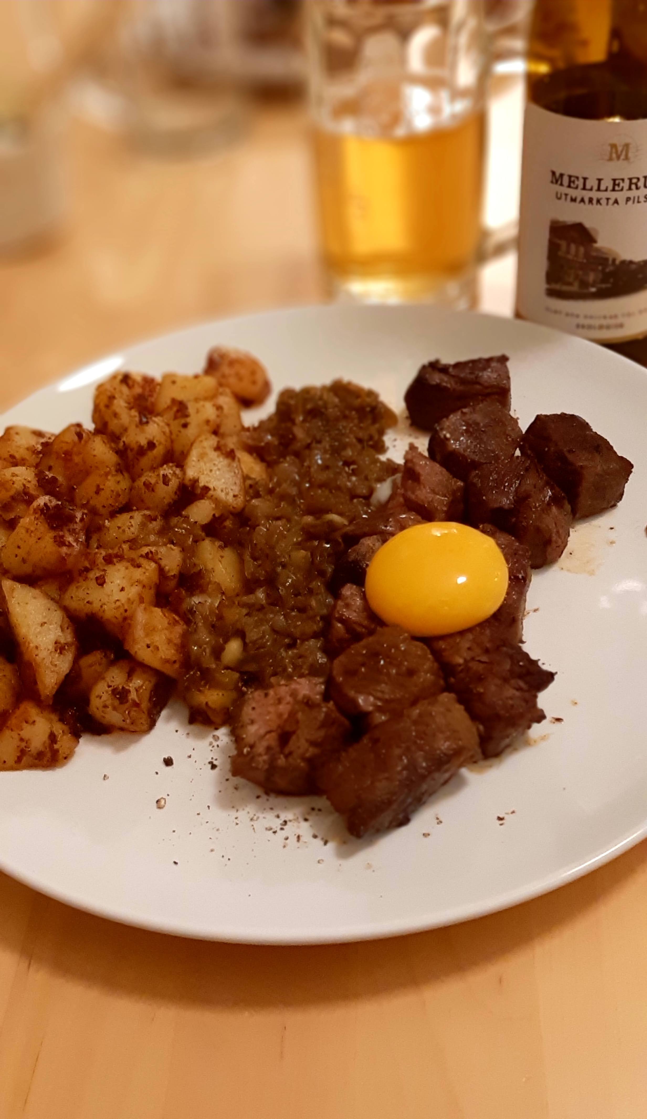 Den här helgen har varit alldeles fantastiskt trevlig, med härlig (coronasäker) AW i fredags och middag hos sonen på lördagskvällen. Och vilken middag sen… Den godaste Biff Rydberg man kan tänka sig, serverad med äggula och senapskräm. Det gick minsann inte av för hackor.