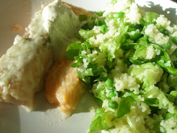När grynen är färdigkokta blandar du dem med salladen. Servera laxen med salladen och senapssåsen. Lätt och läckert!