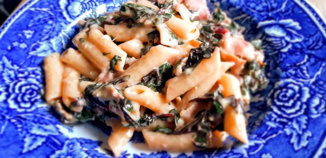 En härlig pastarätt med mangold och knprigt bacon. Mangold kan också bytas ut mot spenatblad. Till receptet >>
