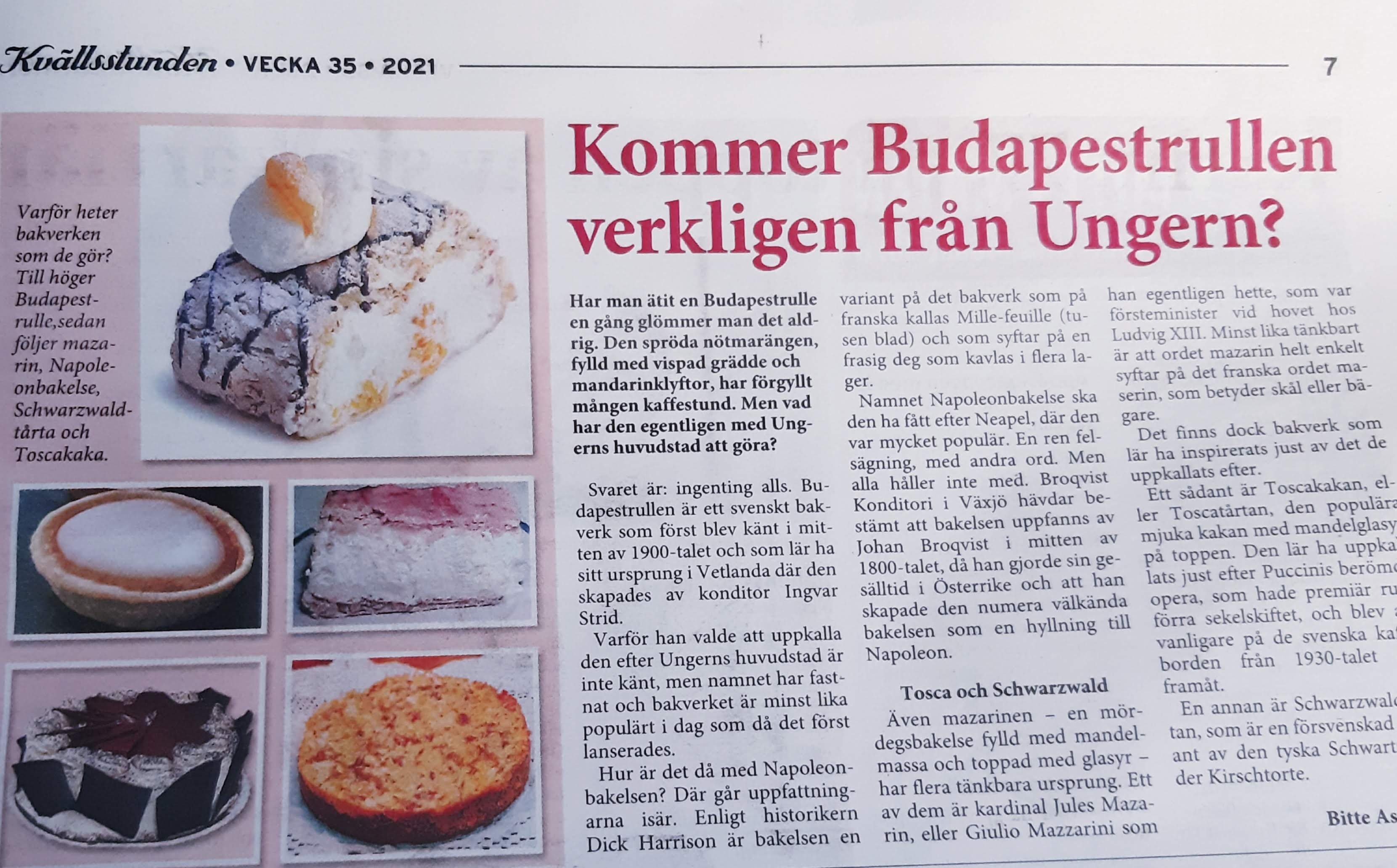 Svaret är: ingenting alls. När jag skrev om detta bakverk tidigare trodde jag att ursprunget var ett konditori i Arvika, men det var fel har jag förstått nu. Budapestrullen lär ha sitt ursprung i Vetlanda där den skapades av konditor Ingvar Strid. Det lärde jag mig när jag gjorde research för en text i Kvällsstunden (se bild nedan). Varför han valde att uppkalla den efter Ungerns huvudstad är inte känt men namnet har fastnat och bakverket är minst lika populärt idag som då det först lanserades.