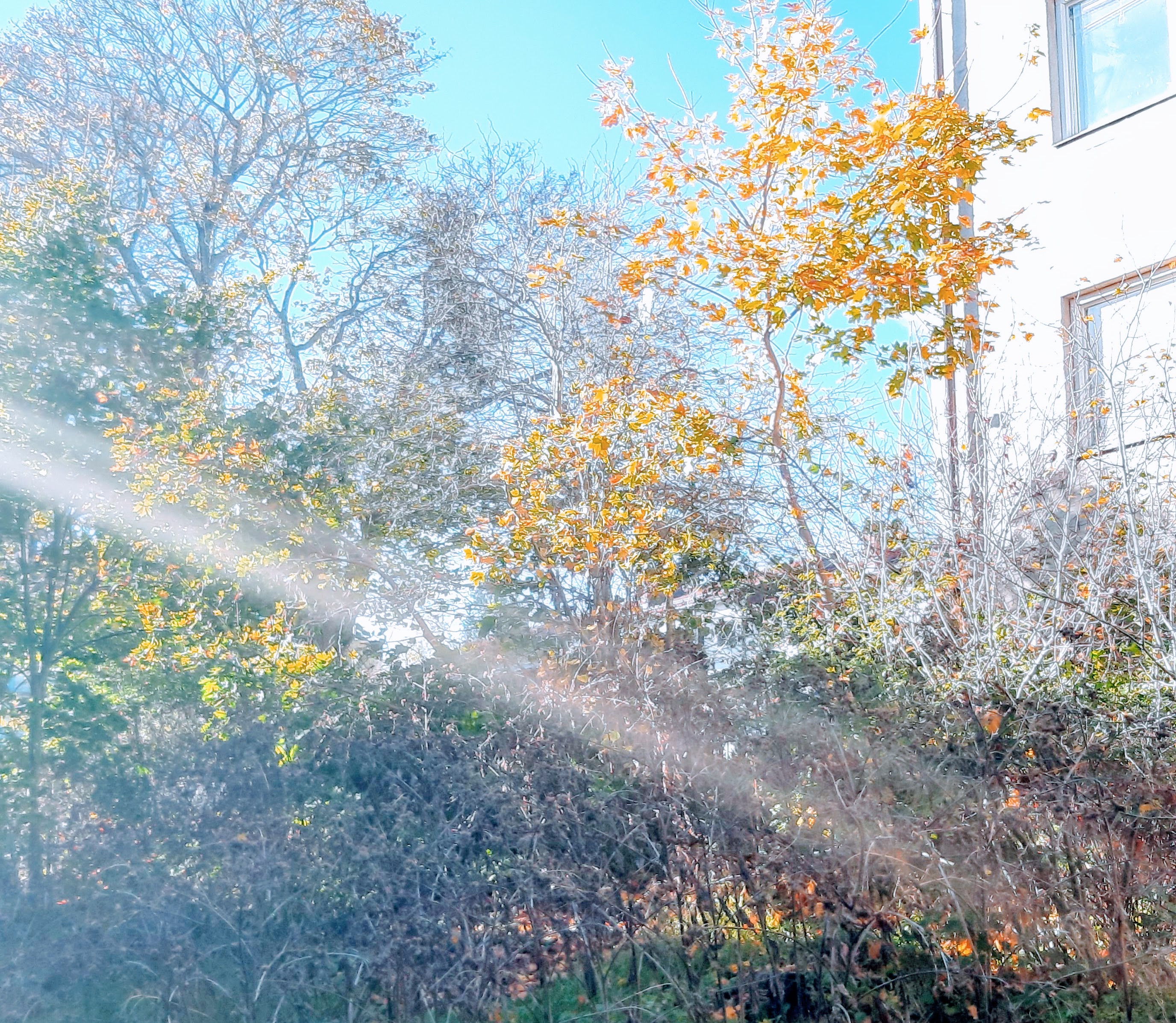 Lördag igen, och jag njuter av en kopp kaffe och en leverpastejmacka med sallad och gurka vid det öppna köksfönstret. Lördagen kommer med strålande sol och flammande färger – gult, brandgult, rött – så här innan de sista löven faller. Det är en så härlig förmiddag att jag önskar att tiden kunde så still en stund.