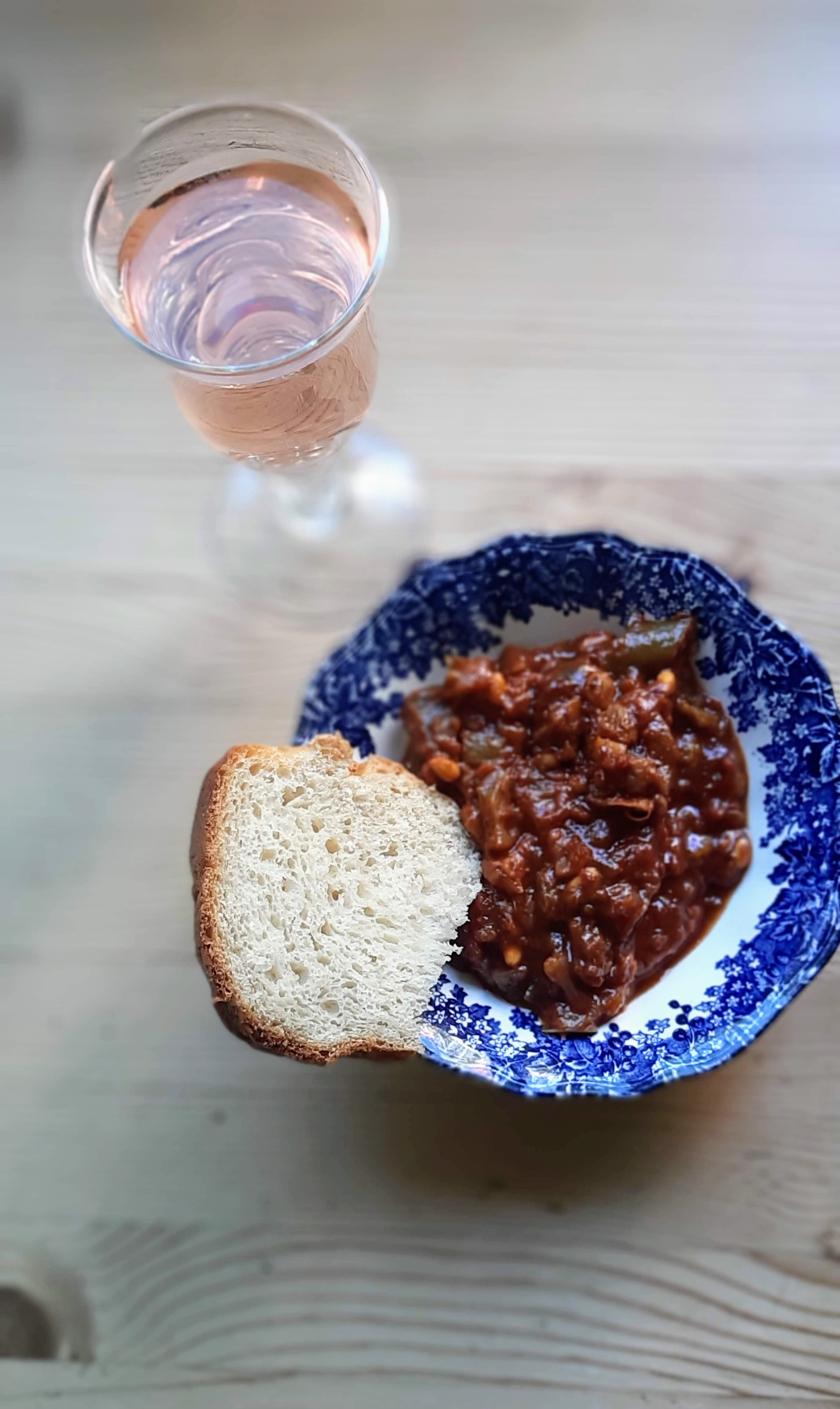 Gör så här: Finhacka löken. Hacka även aubergine och paprika. Fräs i olivolja och strö över lite strösocker. Låt fräsa tills löken blivit mjuk och nästan genomskinlig. Tillsätt tomater och vatten och låt puttra minst 30 minuter, gärna ännu längre, så att röran blir riktigt mosig. Tillsätt russin och pinjenötter samt rödvinsvinäger och koka ytterligare 10 minuter. Servera som ensamrätt med ett gott bröd eller som tillbehör.