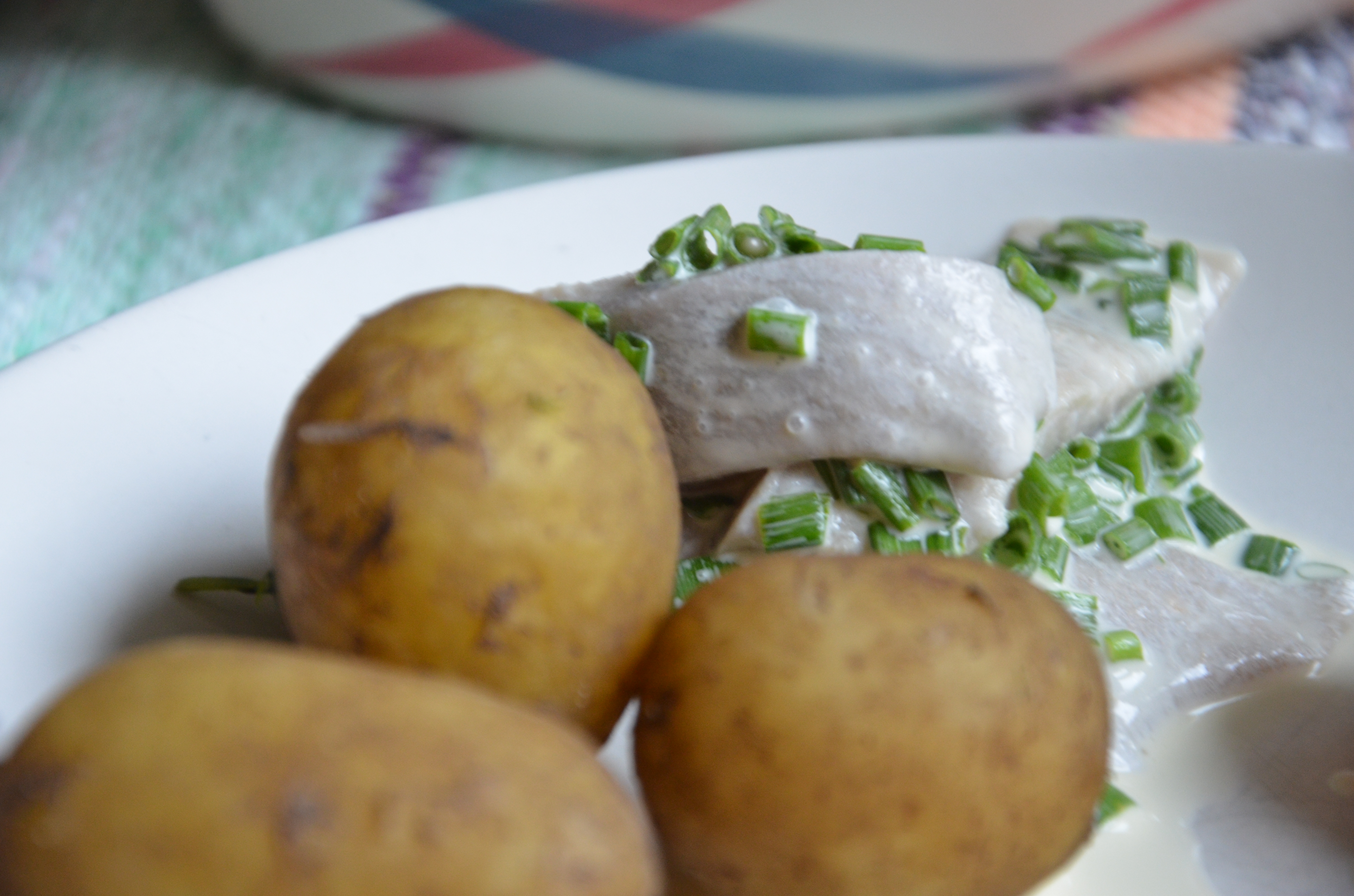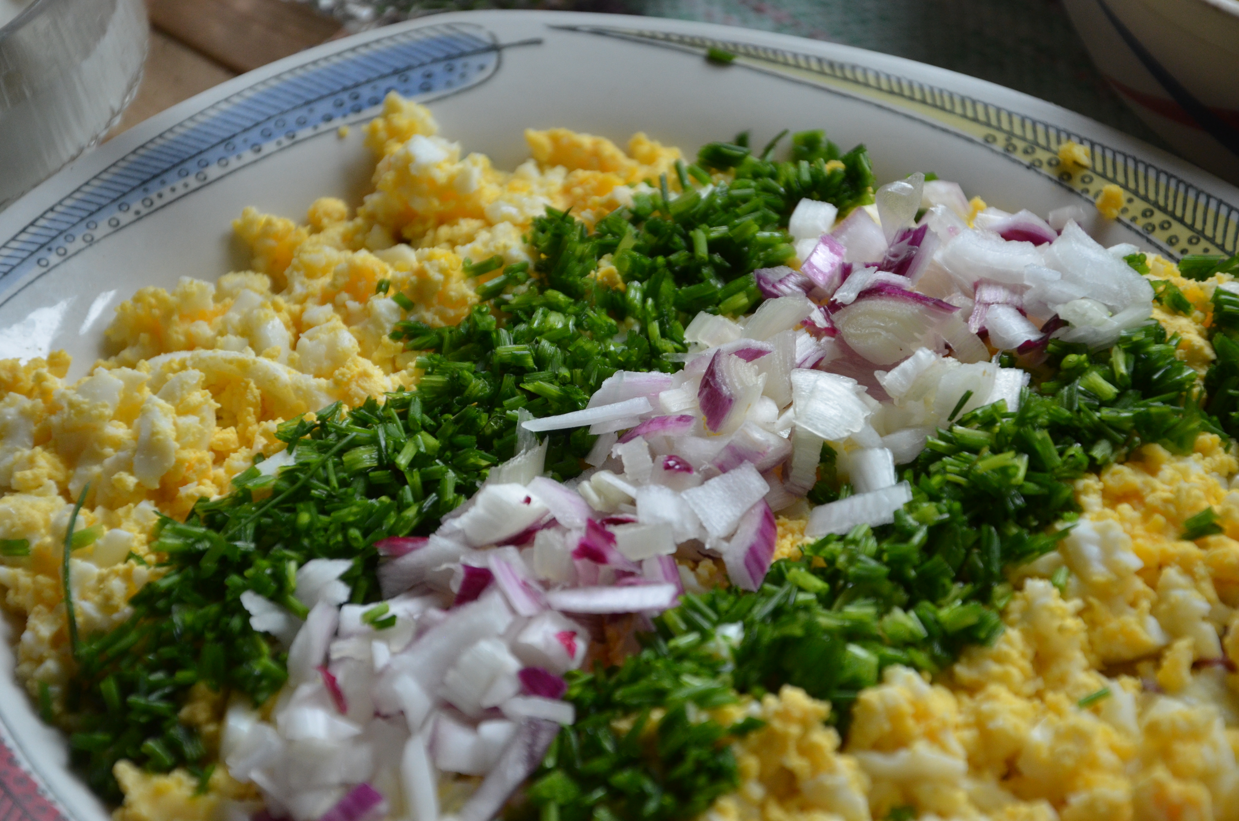 Gör så här: Lägg ut matjesbitarna på ett fat. Hacka äggen och täck sillen med dem. Klipp gräslök och hacka rödlök och lägg dessa i ränder över äggen. Garnera med några dillkvistar och servera med färskpotatis, gräslök och gräddfil. DSC_4835