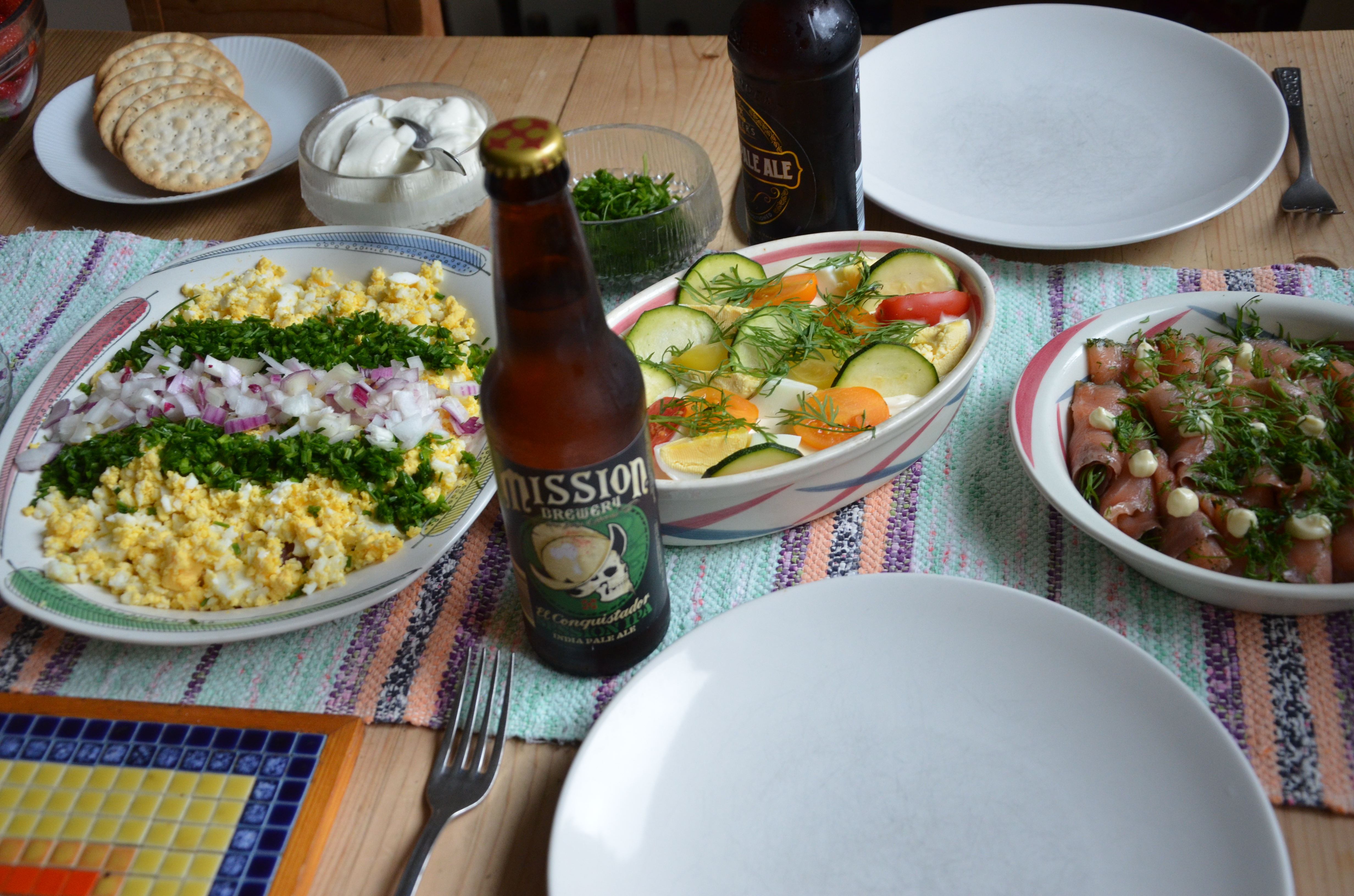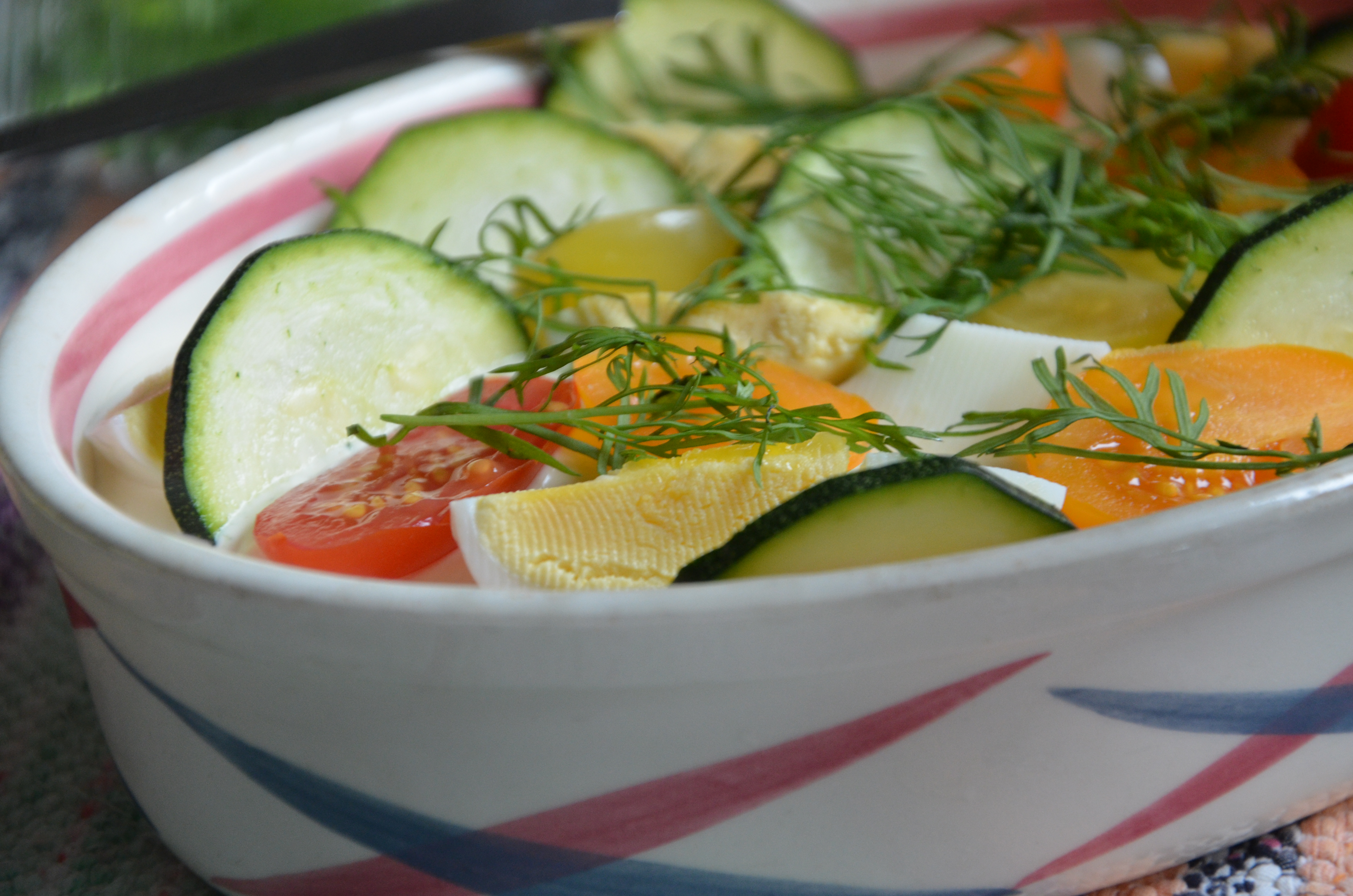Gör så här: Hacka paprikorna och lägg dem i botten på ett trevligt fat. Lägg matjesbitarna över. Rör ihop crème fraîche med senap och svartpeppar och bred detta över sillen. Garnera med tunna zucchiniskivor, halverade cocktailtomater, äggklyftor och dillkvistar.DSC_4841