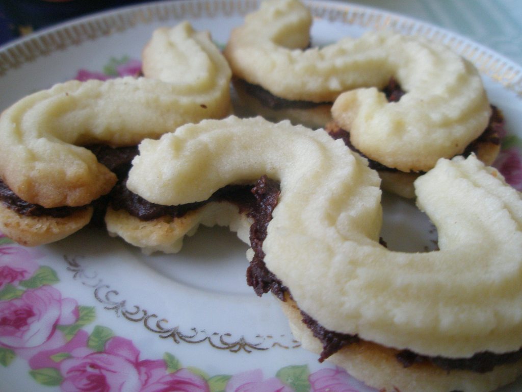 Grädda kakorna på 200 grader i ca 5-8 minuter och låt kallna. Rör sedan ihop smörkrämen och lägg ihop kakorna två och två, med fyllningen emellan. Förvara i kyl eller frys.