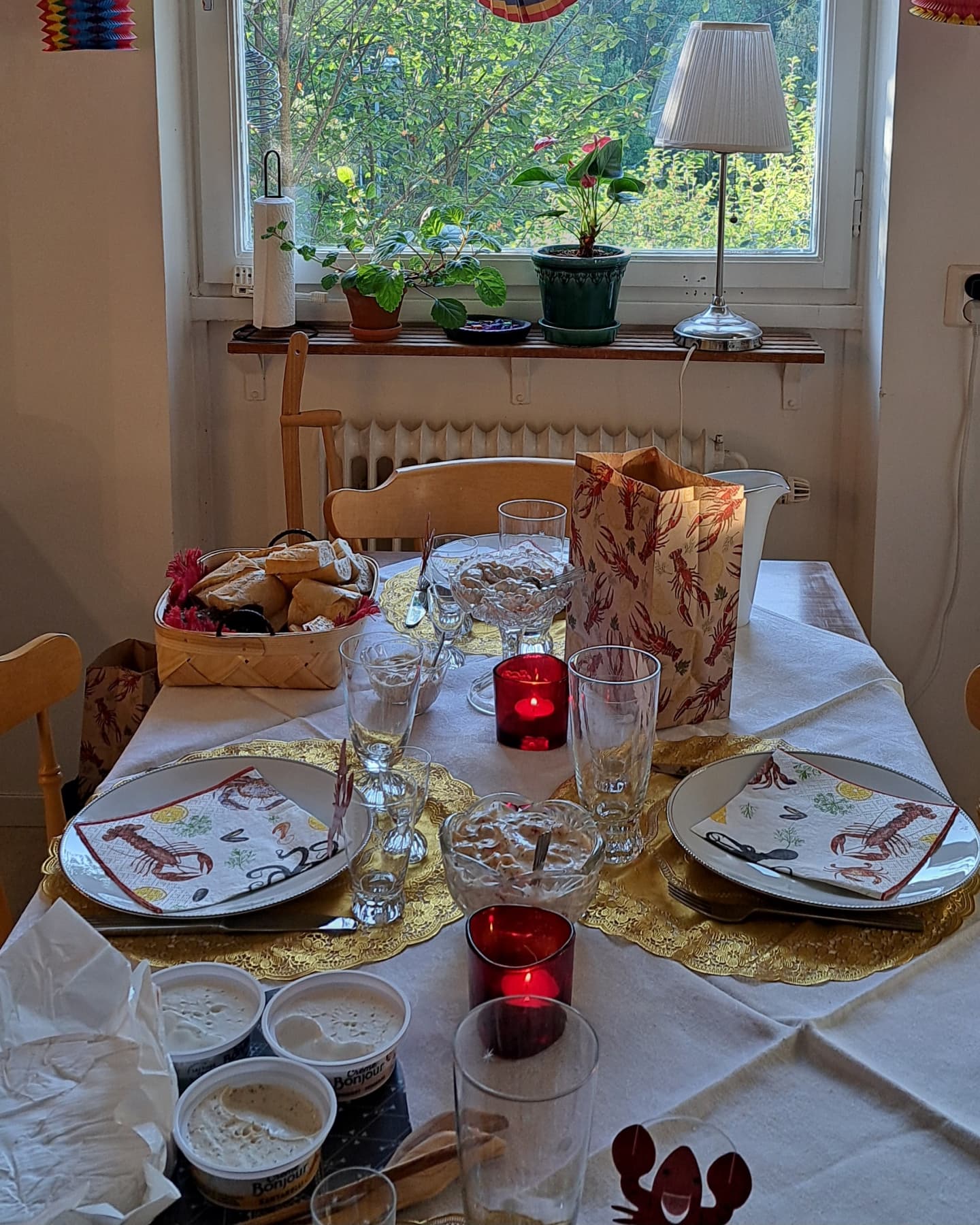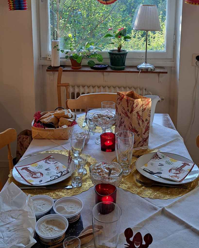 I lördags bjöds det på årets första kräftskiva hemma hos sonen och svärdottern. Kräftor – både det ”röda guldet” och havskräftor – stod på buffébordet, liksom västerbottensostpaj och svärdotterns underbara laxtårta (som aldrig får fattas på ett buffébord numera!) och förstås goda kex och gott bröd med röror och ostar.