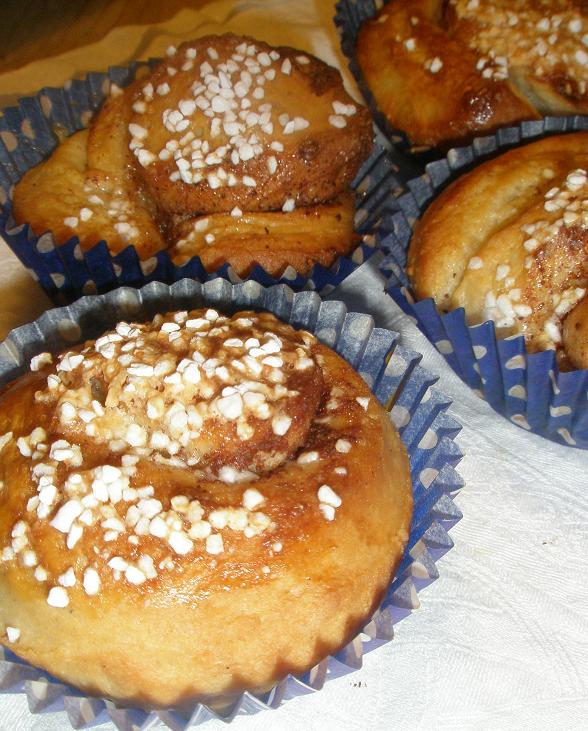 Låt bullarna jäsa på plåt i ca en halvtimme. Pensla sen med uppvispat ägg och strö över pärlsocker. Grädda mitt i ugnen i 8-10 minuter eller tills bullarna fått fin färg.