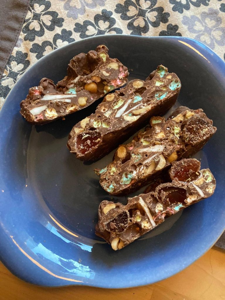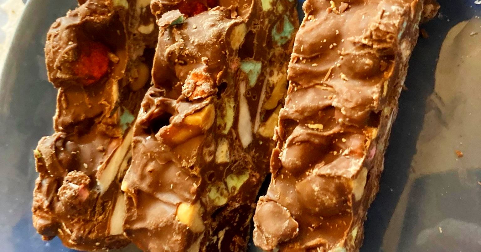 Gör så här: Smält chokladen, antingen i mikron eller i vattenbad. Häll över den smälta chokladen i en skål och rör ner alla godsakerna. Häll smeten i en avlång sockerkaksform som du klätt med bakplåtspapper. Låt stå i kylen tills chokladen stelnat. Skär i ”bars”, med en vass kniv som du spolat med hett vatten och sedan torkat av. Förvara i kylen, i en ask med tättslutande lock.