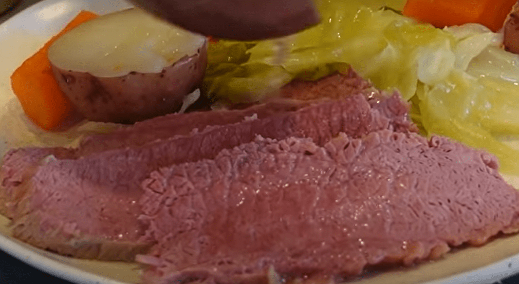 Corned beef and cabbage har, som så mycket annan mat som lagas i irländska kök, sitt ursprung i pragmatism såväl som i ekonomi. Kål är ju stapelvara i det irländska köket även ”hemmavid” och rimmad oxbringa, var relativt billigt och dessutom lätt att få tag i i det nya landet. De inflyttade irländarna skapade därför sin egen Saint Patrick’stradition, och den är lika klassisk i USA som Irish Stew eller Boxty i Irland.