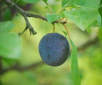Ett blåsvart plommon som sägs vara den första plommonsort som odlades i Sverige.