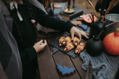 - Dekoration: plastskalle, svart sugrör, röda löv eller “RIP”-skylt