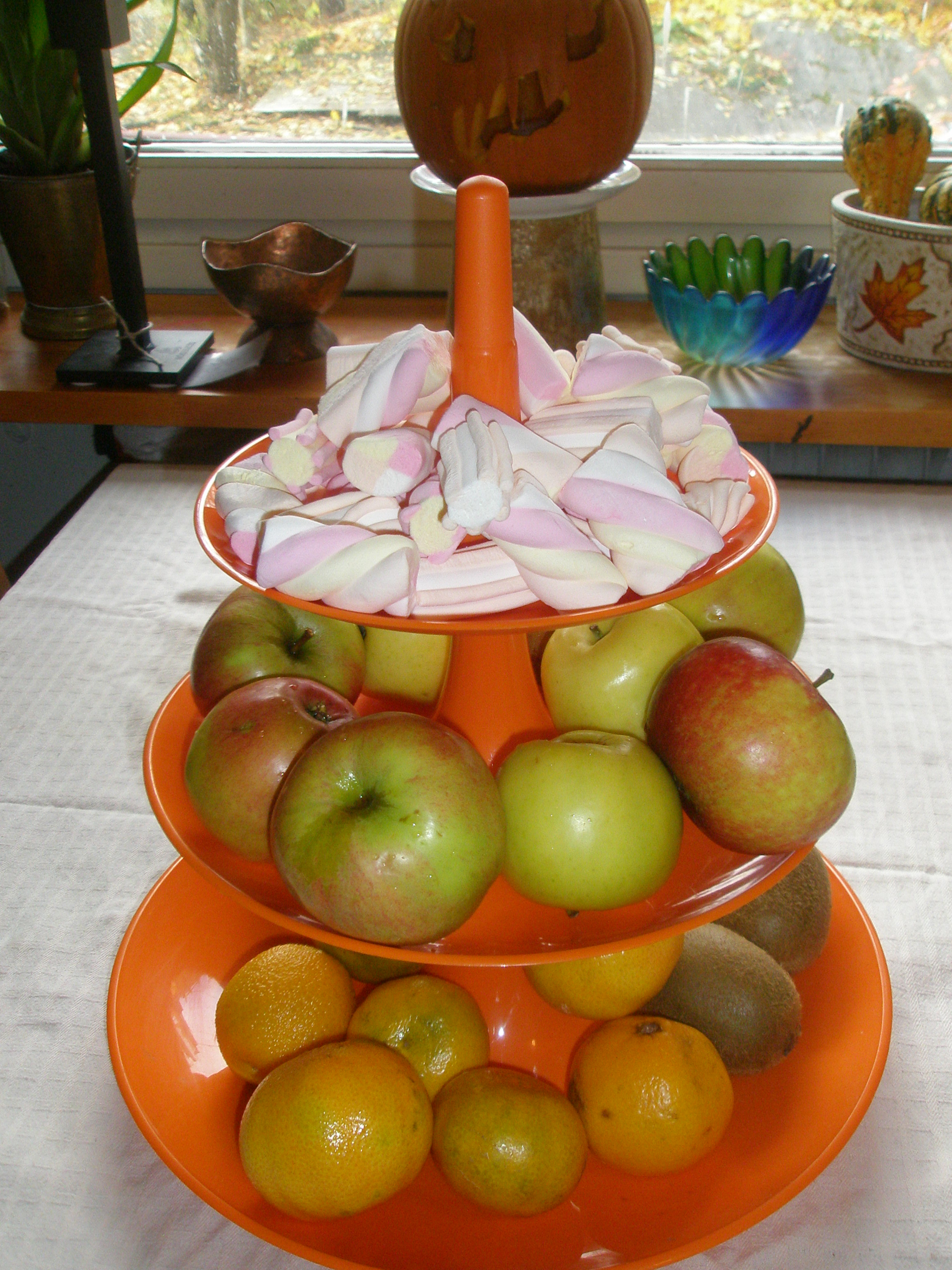 Julen är förstås godishelgen nummer ett – men Halloween är också en helg då man med gott samvete kan äta godis. Så varje år brukar jag fylla mitt vackra trevånings Babelfat med konfekt, mashmallows och frukt av olika sorter.