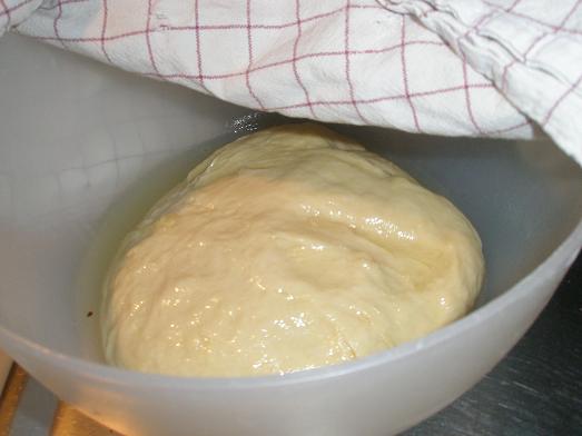 Olja en stor bunke och lägg degen i den. Vänd den så att den oljade sidan kommer upp och låt jäsa övertäckt i ungefär en timme.