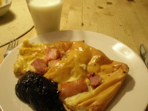 Skär ca 300 g rimmat sidfläsk i tärningar och lägg ut på en smord plåt med ganska höga kanter. Häll över pannkakssmeten och sätt in i mitten av ugnen på ca 180-200 grader. Grädda tills pannkakan fått fin färg och servera med lingon eller annan valfri sylt (jag älskar blåbärssylt till!), eventuellt en god råkostsallad med morot och vitkål och ett glas kall mjölk.