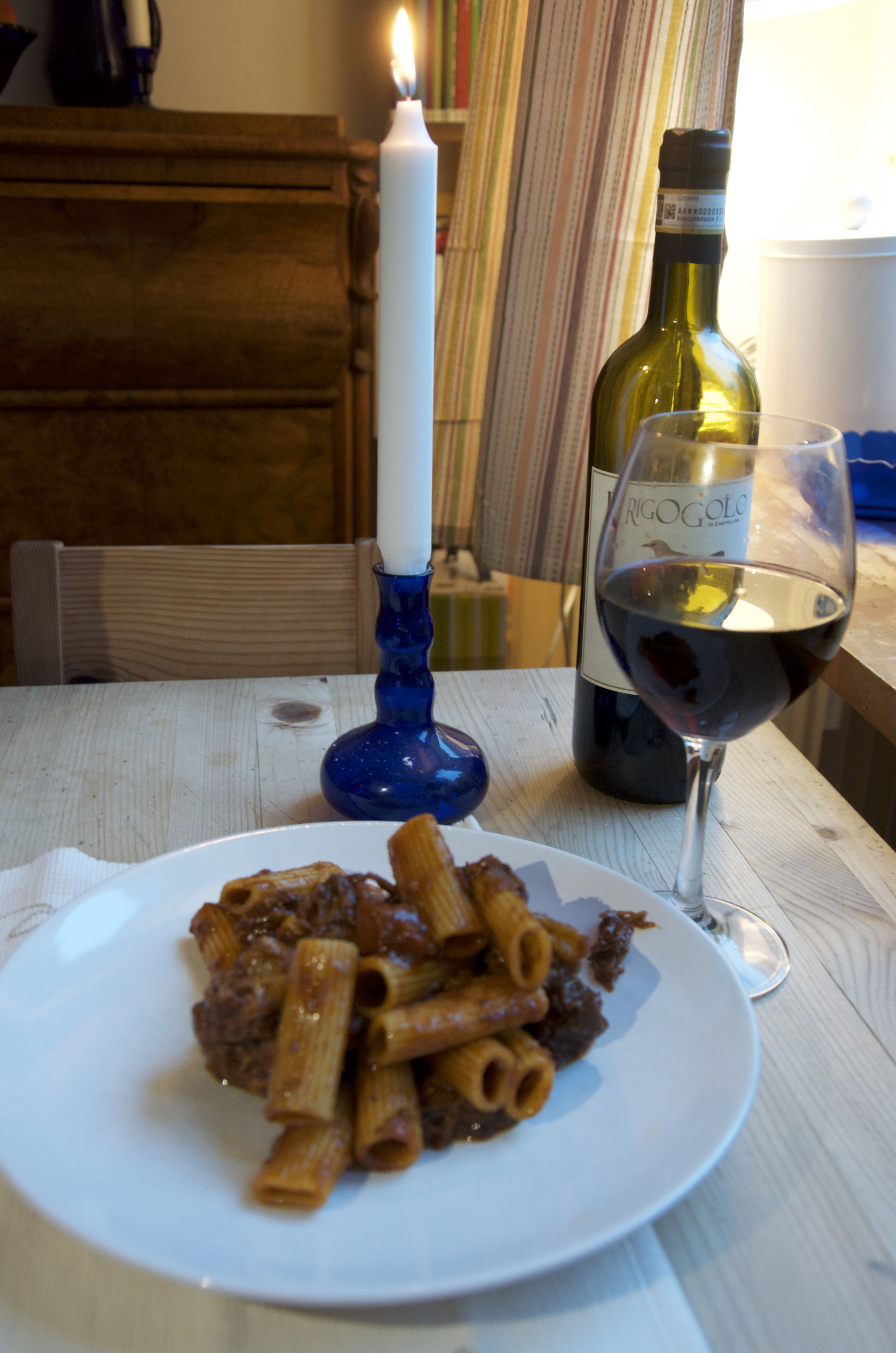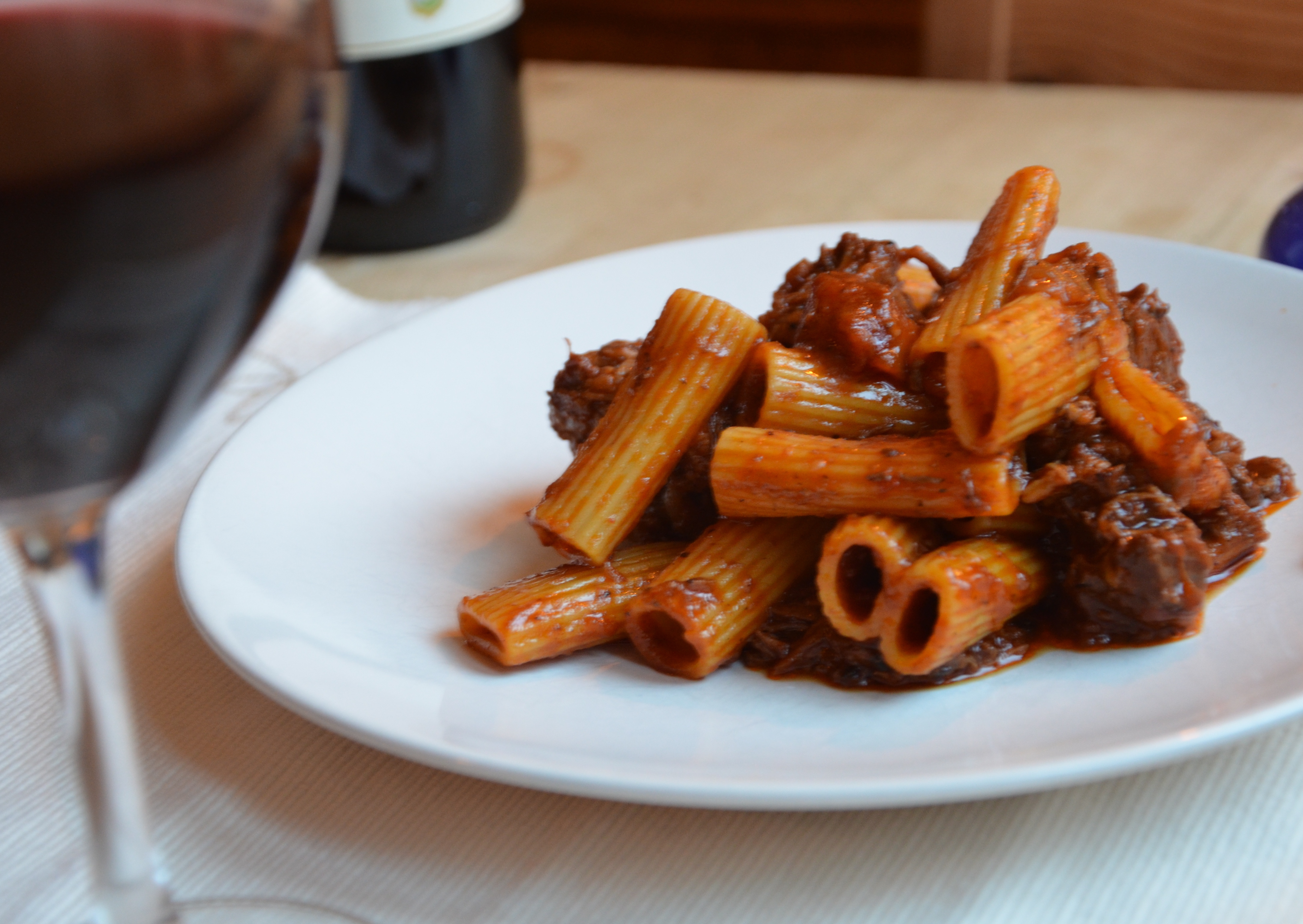 En av mina favoriträtter i det italienska köket är pasta med mustig oxsvansragu. Helst ska det vara rigatoni, men penne eller annan kort pasta går också bra. Det här är ingen snabbmat, den görs helst dagen innan den ska ätas. Men den är väl värd besväret och den tid den tar i anspråk. Det här receptet är avsett för 4-6 personer.
