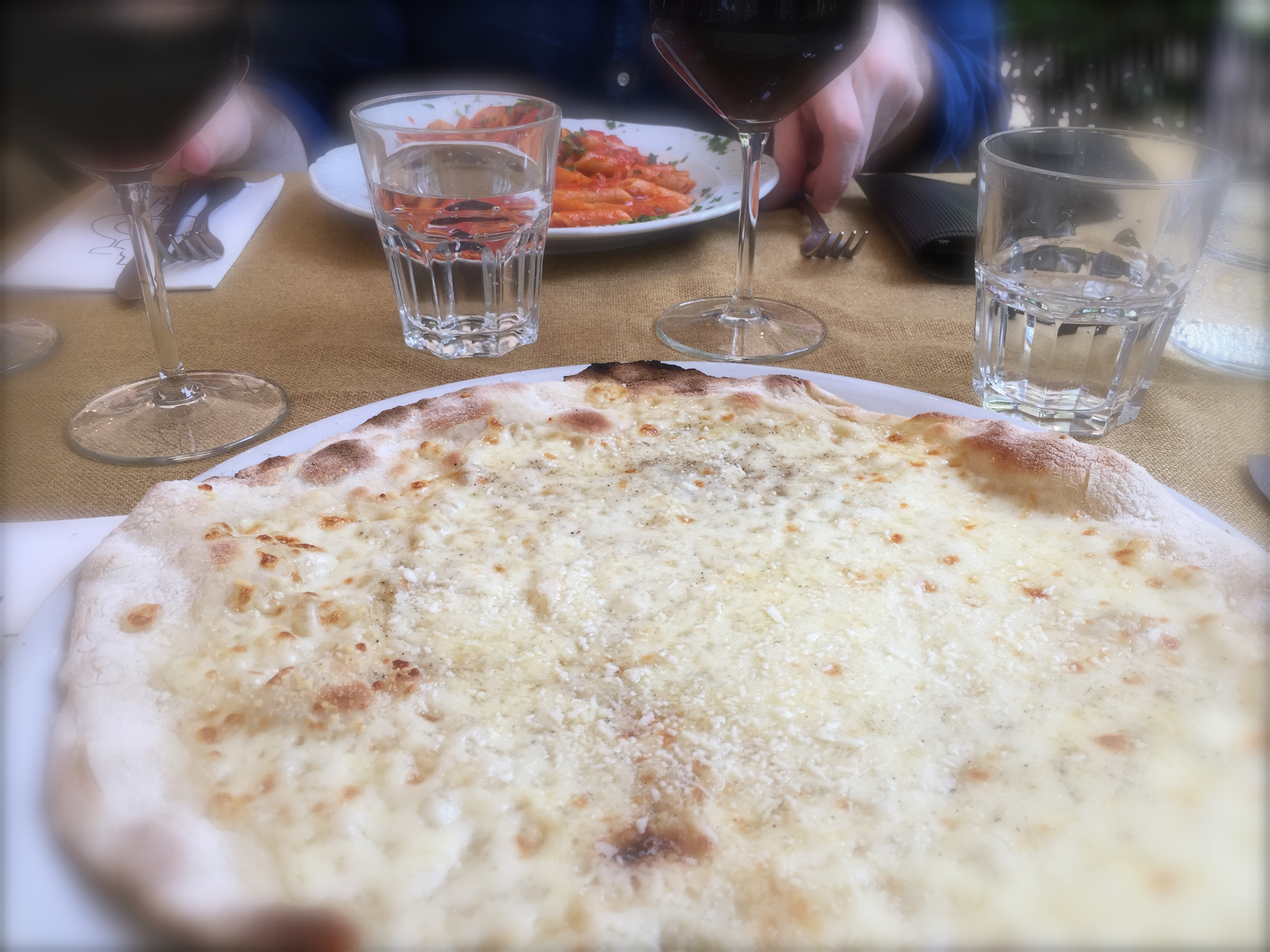 Några av de bästa pizzor jag har ätit har jag ätit i Rom. Och så ska det ju vara. Endast Italien italienska pizzor har, om man säger så. Tunn och knaprig botten och försvinnande god fyllning är den italienska pizzans signum, och en av de allra godaste är den ”vita” pizzan – alltså den som inte innehåller tomatsås. Istället för att bre på tomatsås penslar man degbotten med god olivolja och utgår från det. Väl din egen favoritdeg – eller köp färdig – eller följ receptet nedan. Tänk på att kavla ut den så tunt som det bara går för att få den riktigt god. Sedan är det bara att välja och vraka bland påläggen.