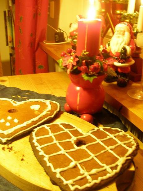 En annan sak som jag alltid gör är stora pepparkakshjärtan som jag trär röda band i och hänger upp i köksfönstret. Jag brukar skära ut dem för hand och trycka ett hål i dem, och sen gräddar jag dem som vanligt – de ska vara lite tjockare än vanliga pepparkakor men inte så tjocka att de blir för tunga. Låt dem ligga plant tills de kallnat helt och dekorera dem sedan – det skapar fin julstämning i köket!