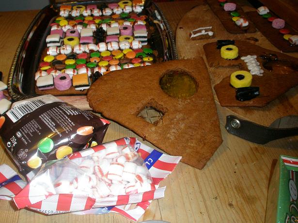 Kavla ut degen något tjockare än till vanliga pepparkakor och skär ut husdelarna enligt din mall. Lägg en eller två delar i taget på smorda plåtar och grädda i 250º ungefär 4-5 minuter eller tills de blivit bruna. Det är viktigt att hålla ordentlig koll – de får absolut inte vara mjuka men de bör heller inte bli så bruna att de ser brända ut…