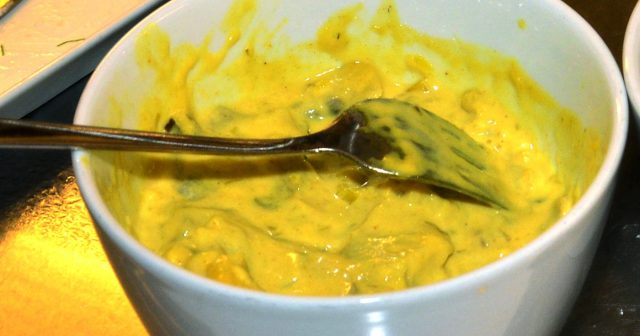 Gör så här: Skär auberginen i ”sillstora” bitar och koka på samma sätt som i föregående recept. Blanda senap, socker, olja och vinäger och vispa ner havregrädden. Häll av vattnet från auberginebitarna och blanda med senapsblandningen. Rör ner lök och dill och blanda varsamt. Smaka av med salt och svartpeppar.