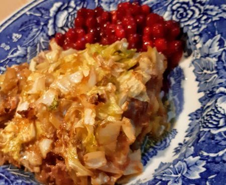 Kålpudding med rårörda lingon