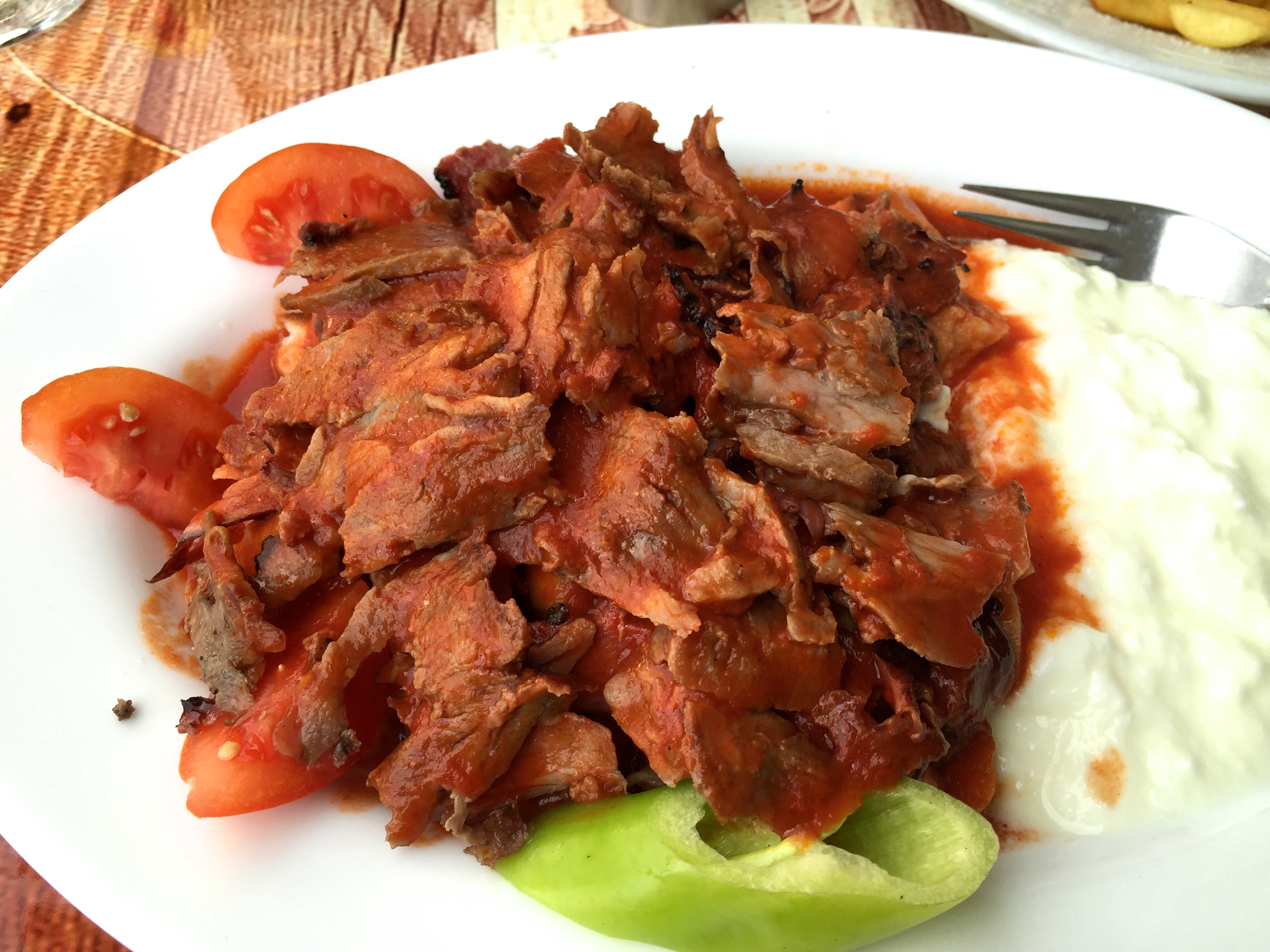 Låt färsen svalna och svep sedan in den i folie och låt vila i kyl någon timme. Ta fram och hyvla eller skär tunna skivor med kniv. Halstra på hög värme i stekpanna och servera sedan med pitabröd, sallad, rödlök, feferoni och goda såser och röror.