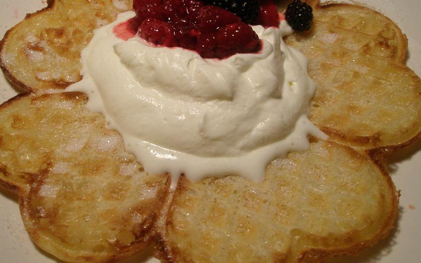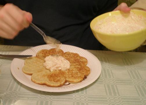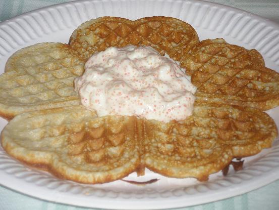 För den som vill undvika grädden, eller som helt enkelt tycker det blir lite väl dyrt med 4 dl vispad grädde i våffelsmeten, finns ett alternativt recept här.